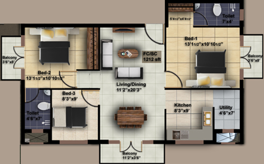 3BHK+2T (1,212 sq ft)