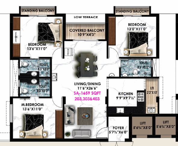 3BHK+3T (1,659 sq ft)
