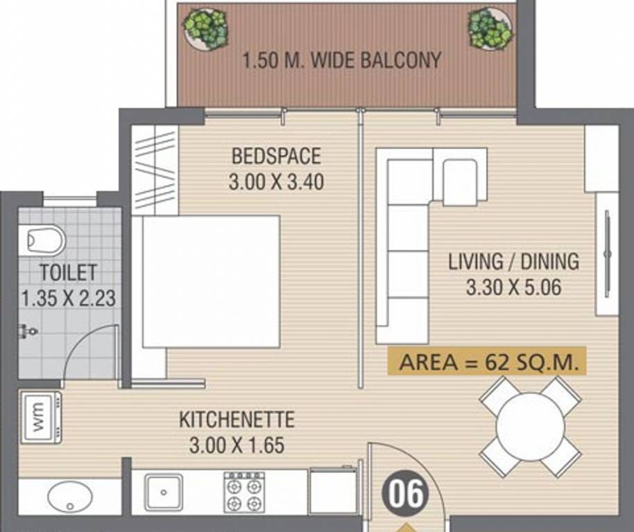 1BHK+1T (667 sq ft)