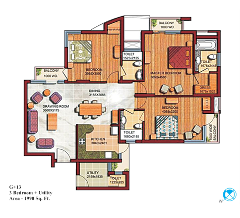 3BHK+3T (1,990 sq ft) + Servant Room