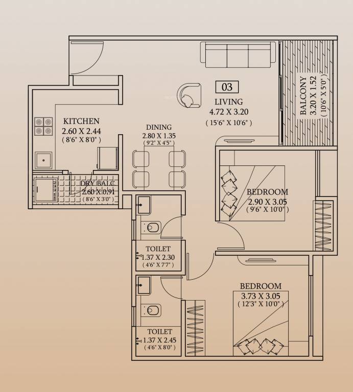 2BHK+2T (725 sq ft)